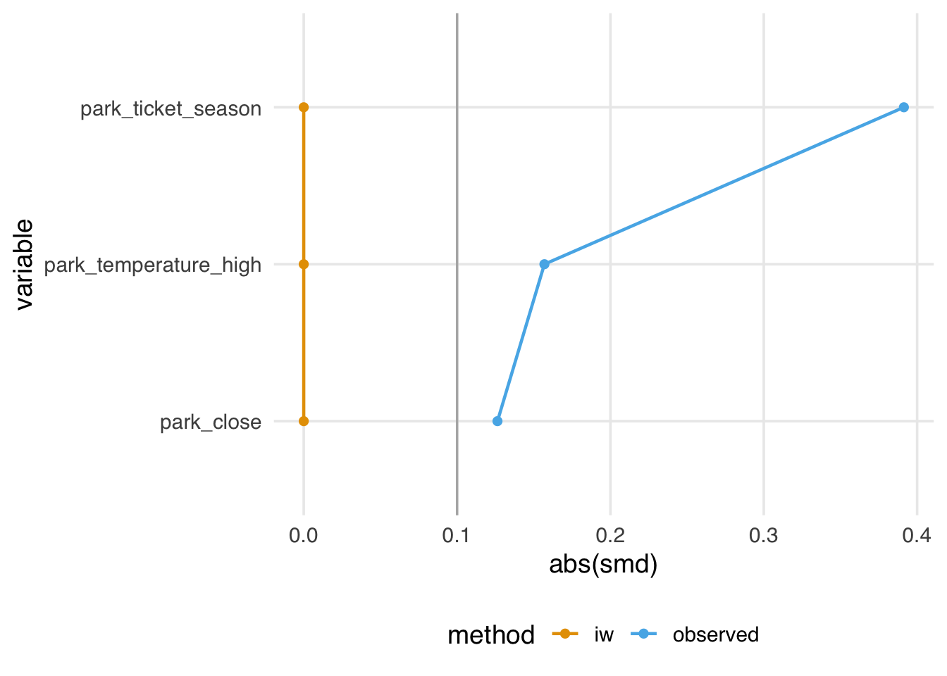 )Figure 10.18 looks similar to the ATM pseudo-population, with slight attenuation, as evidenced by the increased downweighting in the exposed population. We prefer using the ATO weights when the overlap (or evenly matchable) population is the target, as they have improved variance properties. Another benefit is that any variables included in the propensity score model (if fit via logistic regression2) will be perfectly balanced on the mean. Let’s look at a Love plot. In Figure 10.19, all three covariates have an SMD of 0 when weighted by ATO weights.