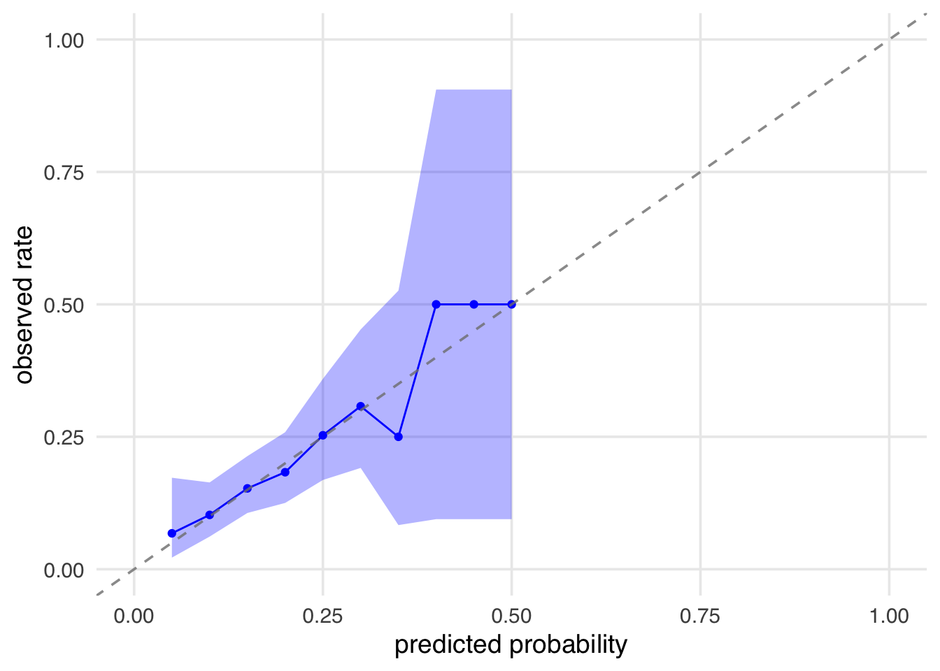 Figure 8.5: Calibration plot for the propensity score model. The points are close to the 45-degree line, indicating that the model is well-calibrated. However, we have few points towards the higher end of the propensity score, so we are more uncertain about these.