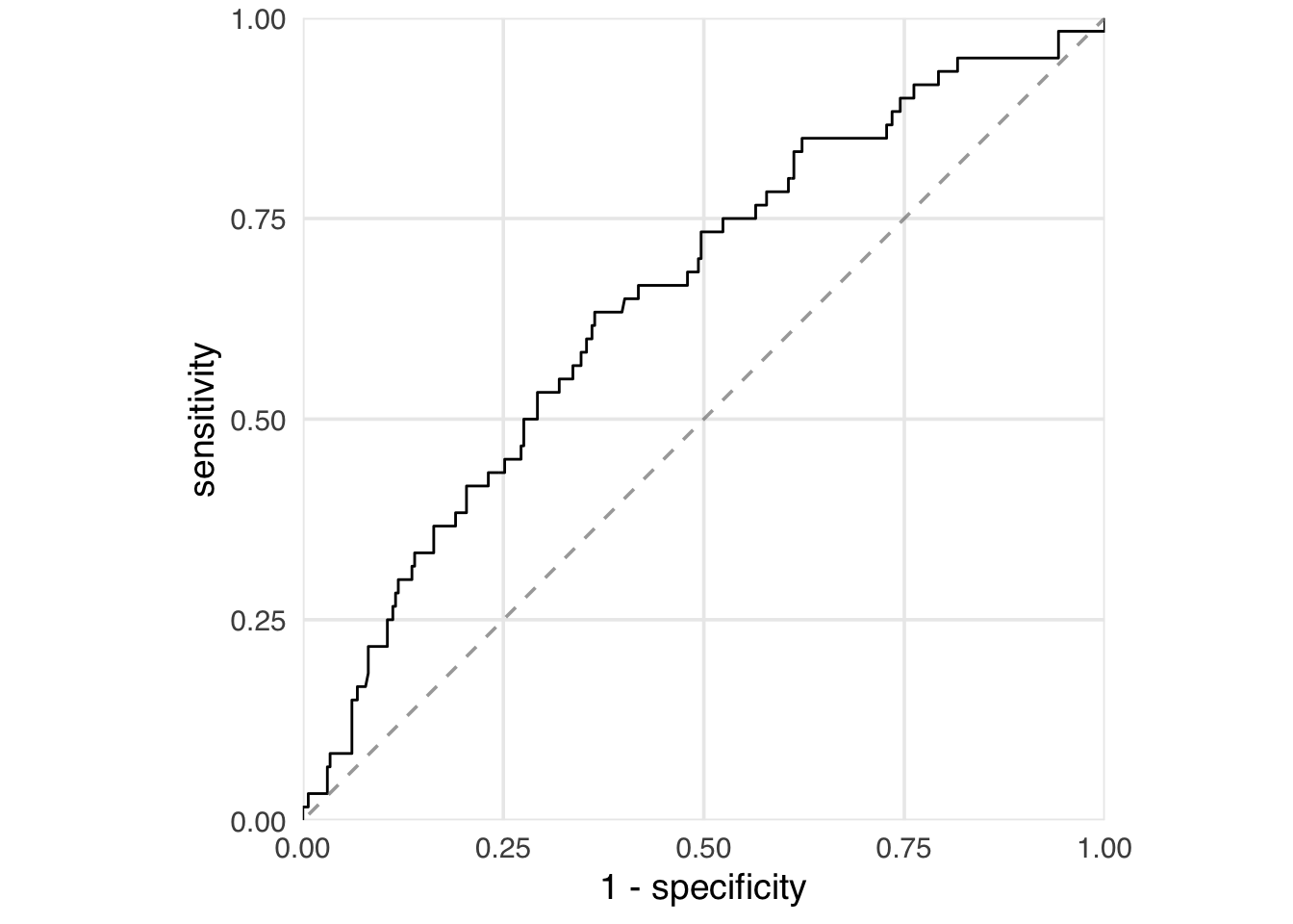 Figure 8.6: ROC curve for the propensity score model. The curve is above the 45-degree line, indicating that the model has some discrimination. The AUC is 0.65, indicating that we’ve picked up enough signal from the confounders to use for adjustment but not so much that we have extreme positivity issues.