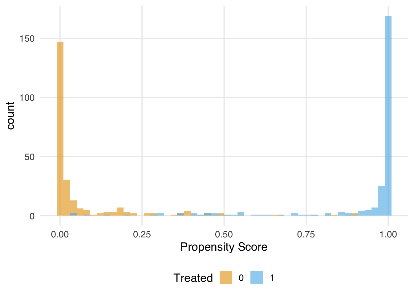 ps_model <- glm(x ~ z, data = sim_poor, family = binomial())Warning: glm.fit: fitted probabilities numerically 0