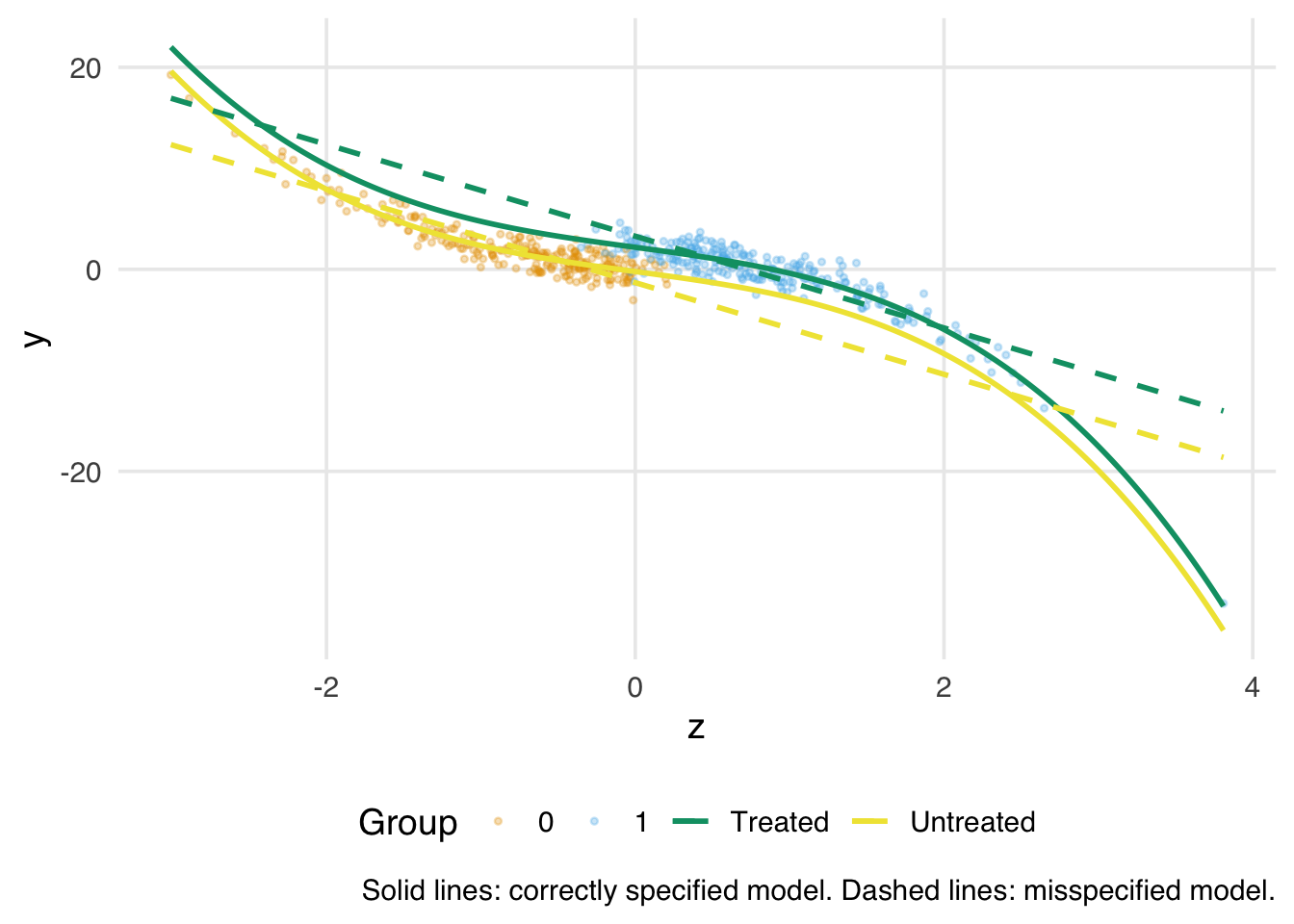 The misspecified model produces a noticeably biased estimate. The bias is concentrated in the tails of the covariate distribution, exactly where overlap is poor and where we are relying most heavily on the model to fill in the gaps. We can see this by plotting the fitted outcome surfaces from the two models against the true cubic relationship.