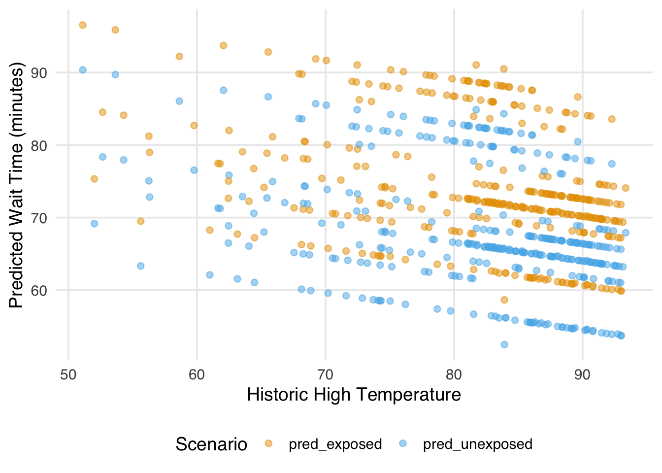 We can visualize what is happening by plotting the predicted wait times under each scenario against a covariate, for example here, the historic high temperature.